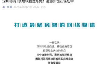 深圳将有3条地铁直达东莞!通惠州也在谋划中 奥一新闻 2025年08月21日 20:42 广东